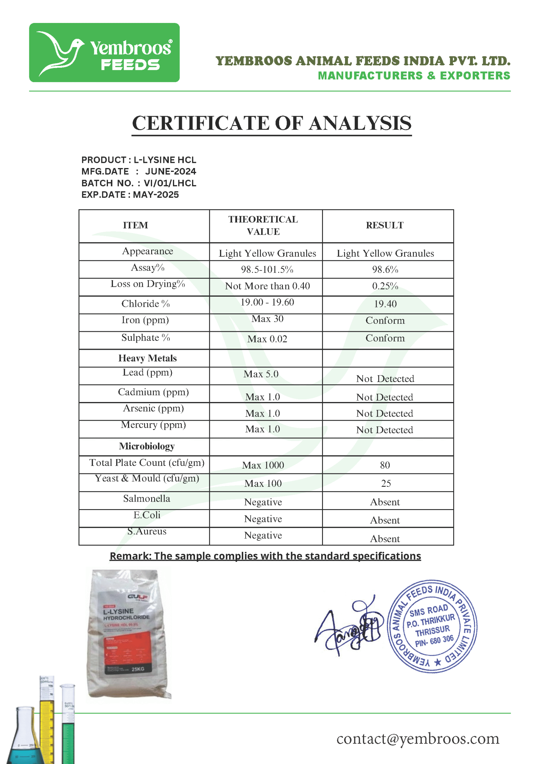Yembroos Animal Feeds India Private Limited is recognized as a leading L-Lysine HCL (L-Lysine Mono HCL 98.5%) Supplier, L-Lysine HCL Exporter, L-Lysine HCL Distributor, L-Lysine HCL Vendor, L-Lysine HCL Company, and L-Lysine HCL Trader serving global animal nutrition markets. With strong sourcing capabilities, reliable manufacturing partners, and strict quality standards, Yembroos® is trusted by international feed mills, integrators, premix manufacturers, and trading companies for consistent and dependable Lysine supply.